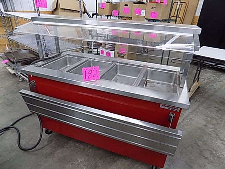 Delfield # KH-4-NU Heated Mobile 4 Comp Serving Station, SN 66527303M, NSF, Caster Mounted , Sneeze Guard , Flip Up Shelf