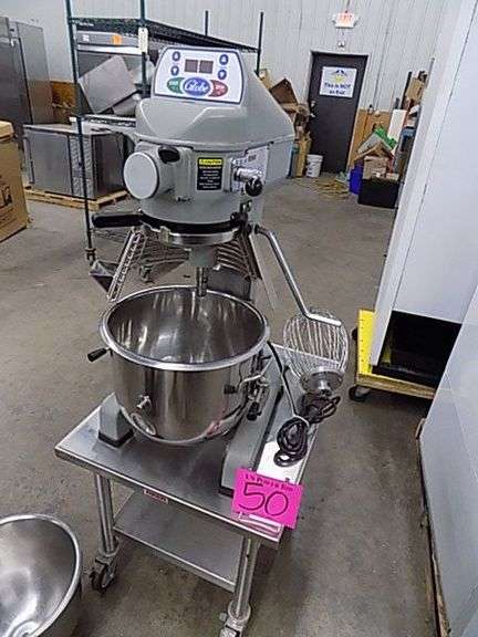 Globe # SP20 , 20 Qt Mixer w/ SS Caster Mounted Equip Stand , SN 7238818, NSF w/ Whip , Paddle , Dough Hook, 2 SS Mixing Bowls