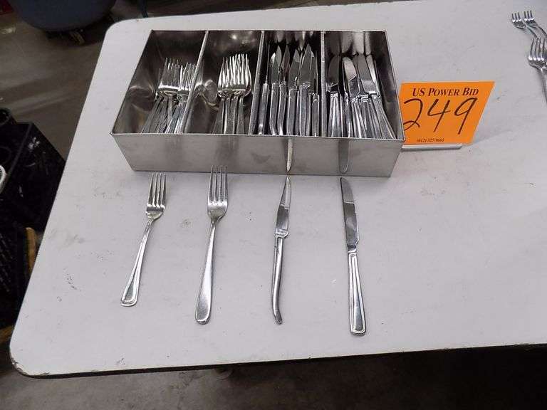 Vollrath SS Four Compartment Cutlery Box,Thirty Don Butter Knives, Thirty Fortessa Steak Knives & Twenty Five Dinner Forks